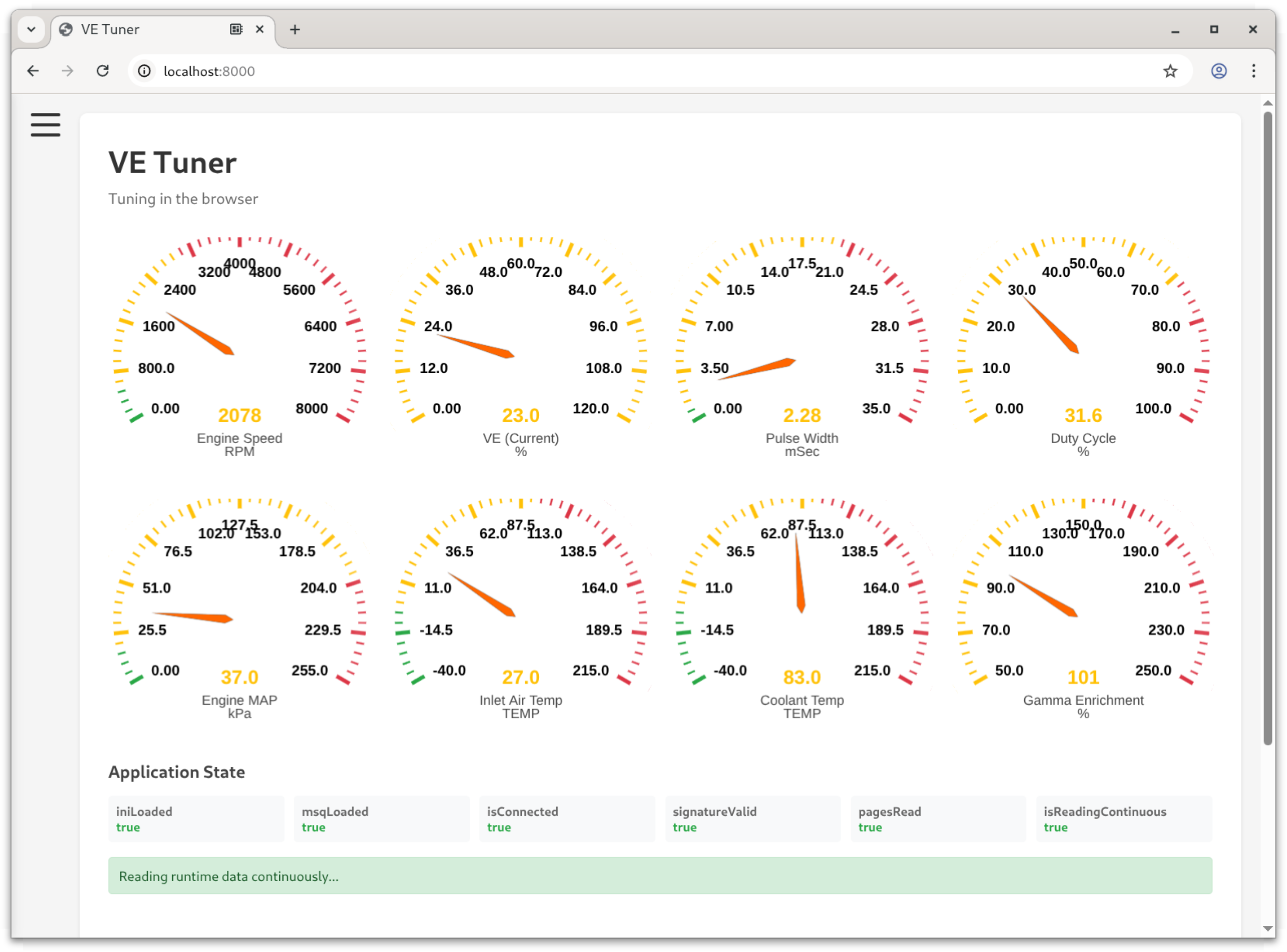 This is Chromium using WebSerial to talk to a Speeduino ECU having parsed the INI, loaded all the pages from the ECU and chugging through the live data at 50Hz. All running locally in the browser.